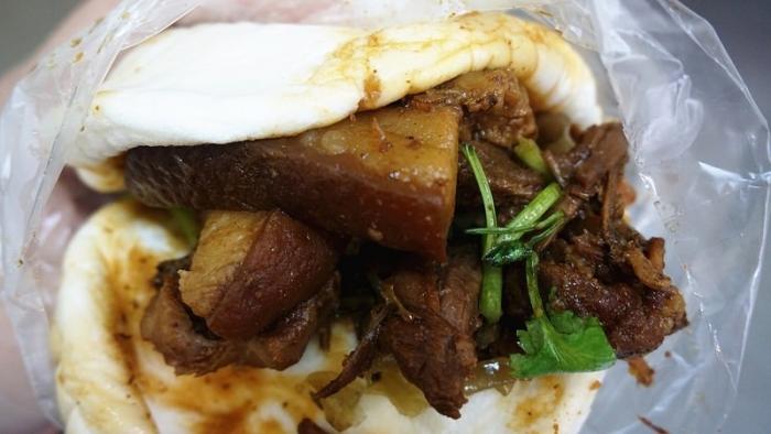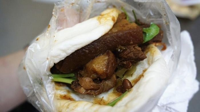 裡面夾有肥瘦參半的五花肉、花生粉、酸菜、香菜!滷汁非常夠味,看其他網友說肉的肥瘦可以跟店家要求,但我沒要求過,因為通常不特別要求就是有肥+瘦,本來就是我喜歡的,也就沒特別調整!有些人不愛吃肥肉,就要記得和店家說喔!
