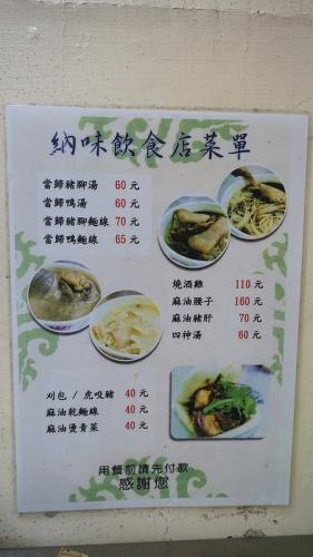位子旁邊的牆上都會貼上一張選單給客人參考點餐,除了店家的招牌虎咬豬和四神湯之外,也有一些麻油系列與當歸系列產品,他們的麻油餐點也蠻多客人點的,下次會想去試試看!餐點的價格就是一般的小吃店價格,40-70元左右平實的價格。