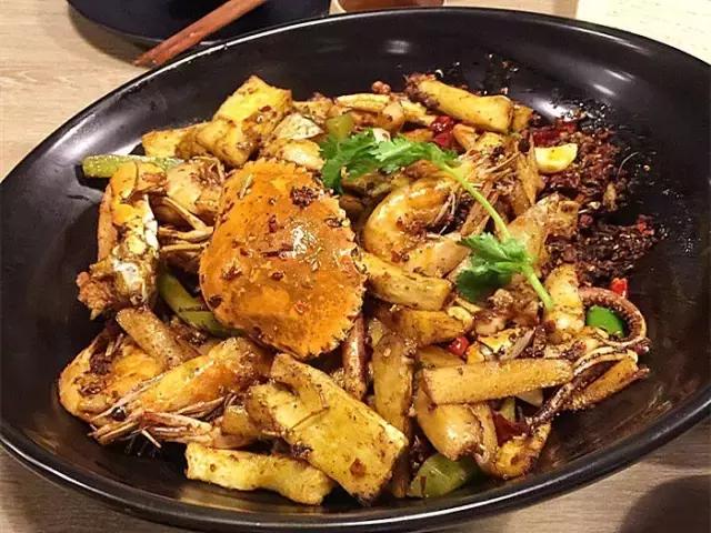 在傳統乾鍋的基礎上不斷做出改進!整個香辣蟹鍋裡有鮮嫩的蟹肉、軟糯彈牙的年糕、筋香濃郁的雞爪...